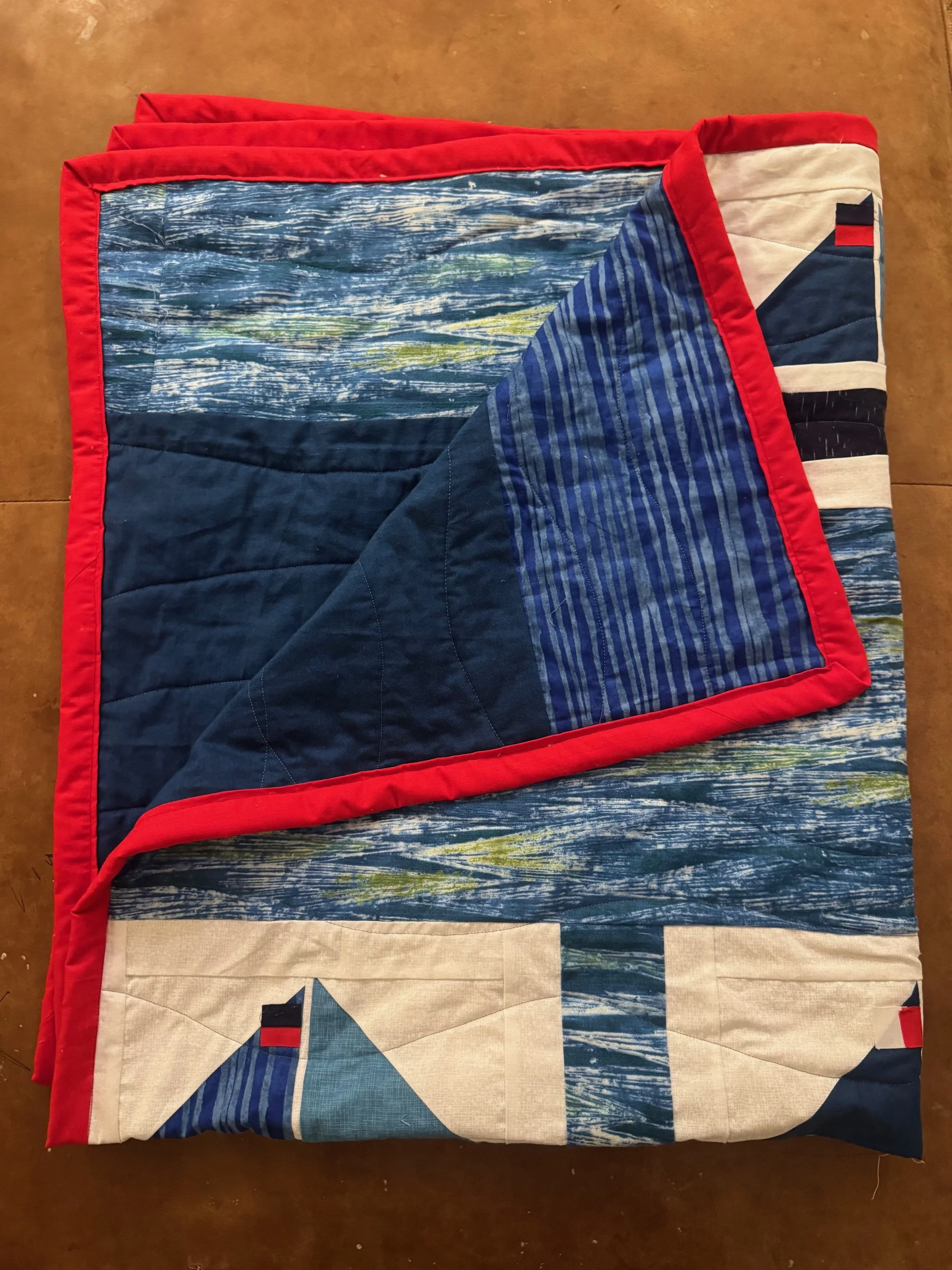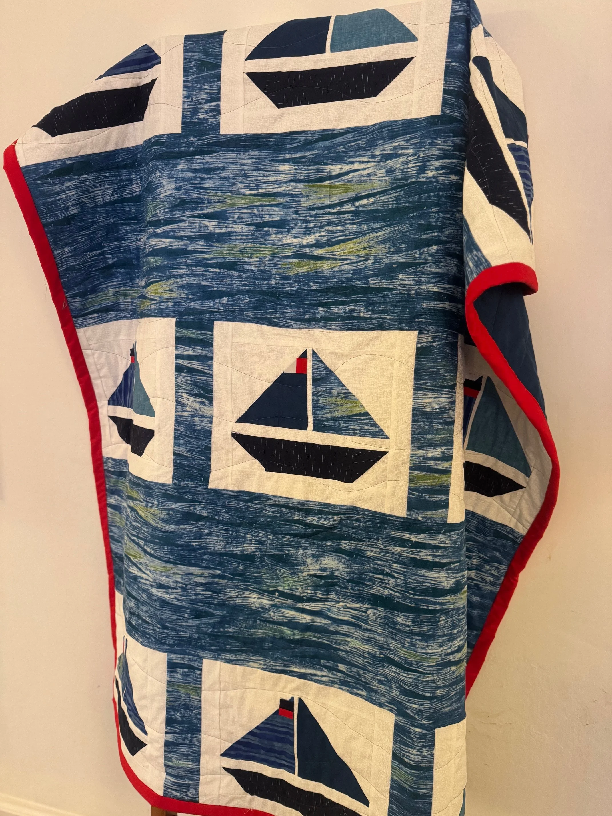This custom quilt is for a baby boy in California. It was designed with a nautical theme, incorporating sailboats, deep navy tones, and coastal-inspired details.