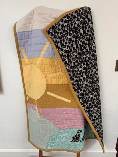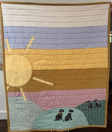 This quilt was made for a one-year-old baby girl, inspired by a peaceful landscape and featuring four small dogs to represent her family and the moments they share together.
