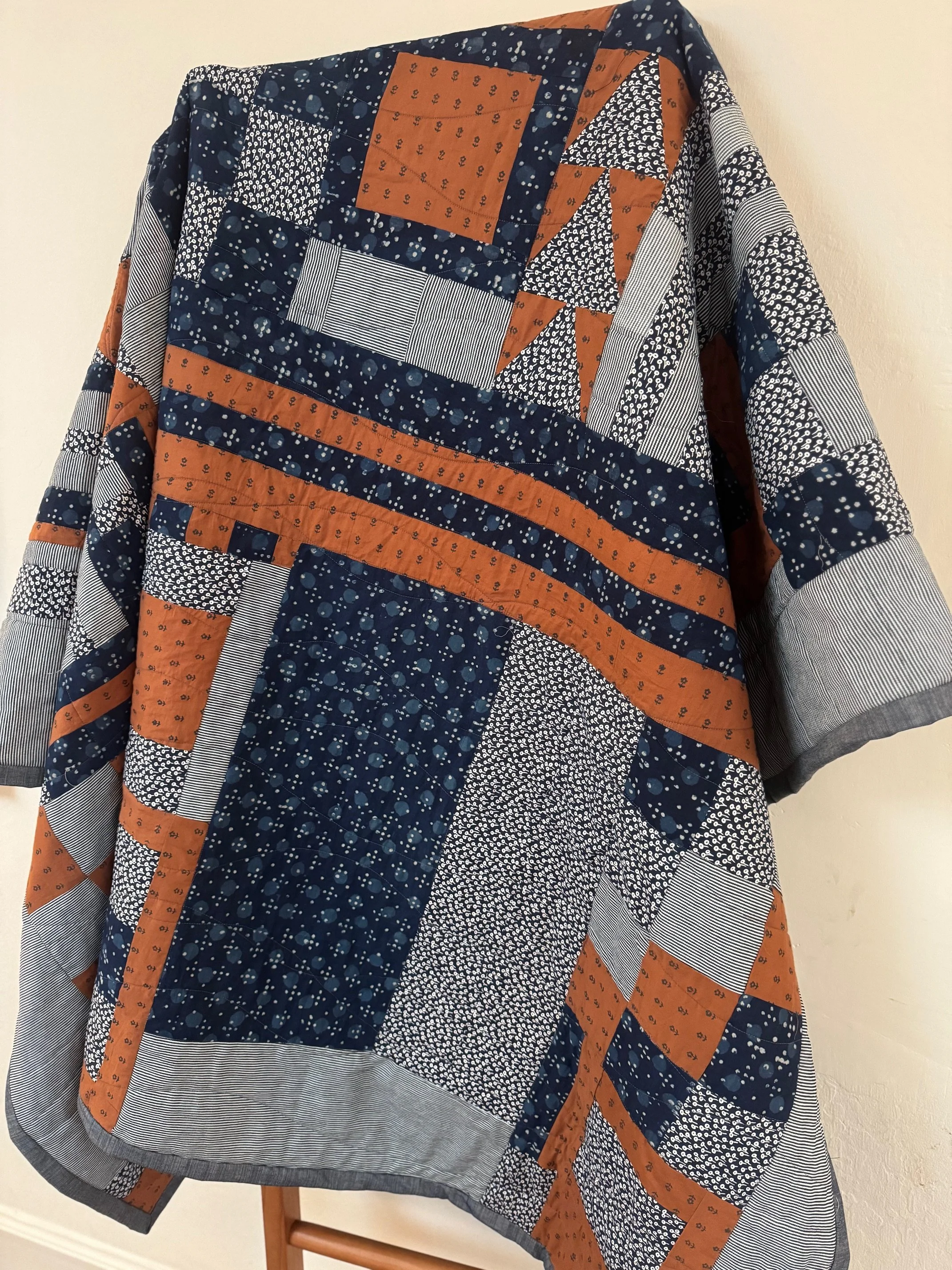 My husband asked me to make a quilt for the couch in his office — something a bit more modern than my usual designs. I took the opportunity to explore improv quilting, a style that invited me to loosen the rules, think differently about structure, and lean into creativity in a new way.